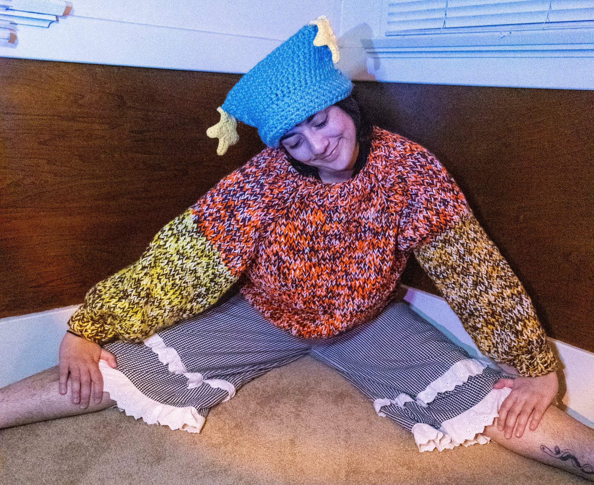 Three worsted weight yarns were knitted together to make him. Gold, yellow, orange, brown, and white. Very much giving autumn vibes, in my opinion.